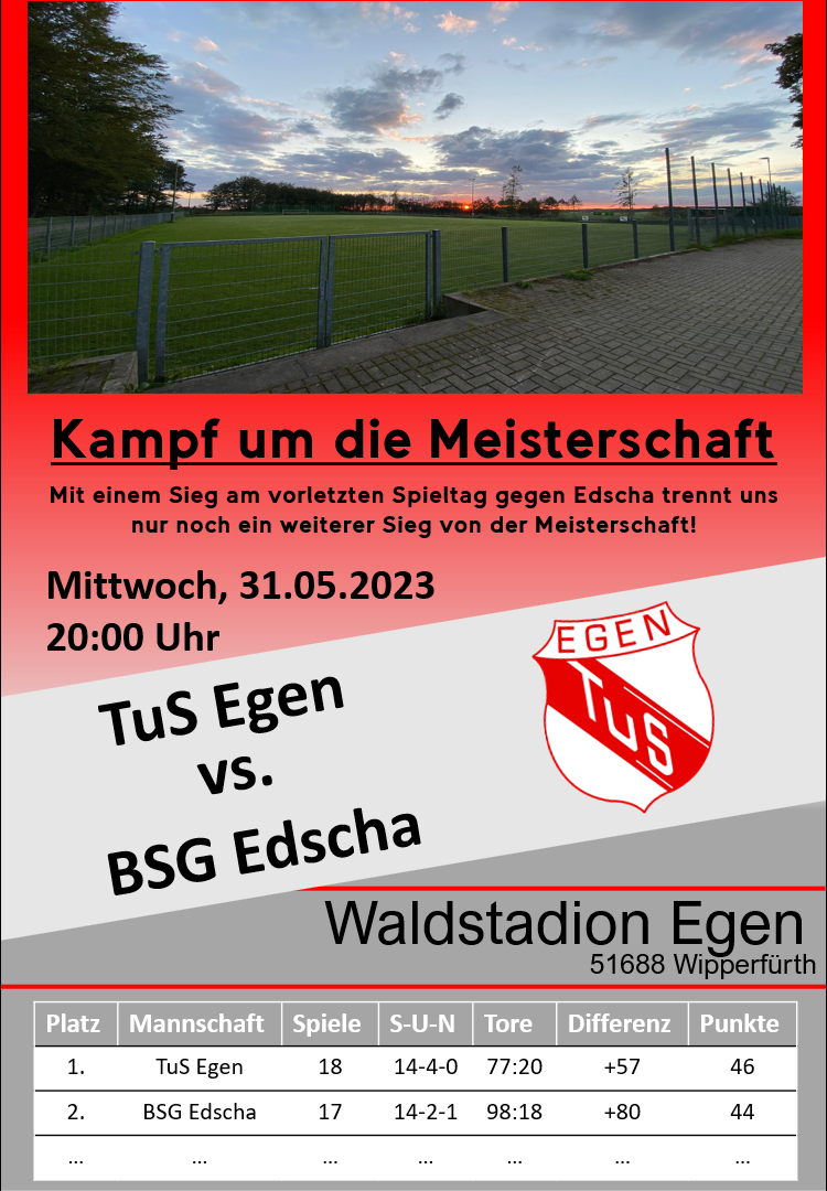Am Mittwoch, dem 31.05. wird um 20:00 Uhr die BSG Edscha im heimischen Waldstadion Egen zu Gast sein. Gerade einmal zwei Punkte trennen uns im Kampf um den diesjährigen Titel. Ein Sieg ist Pflicht, sodass wir am letzten Spieltag (Freitag, 16.06., Waldstadion Egen) den ersten Meistertitel der Vereinsgeschichte einfahren können. Wir brauchen unbedingt die Unterstützung an der Seitenlinien, damit wir das langersehnte Ziel Mieterschaft endlich erreichen!